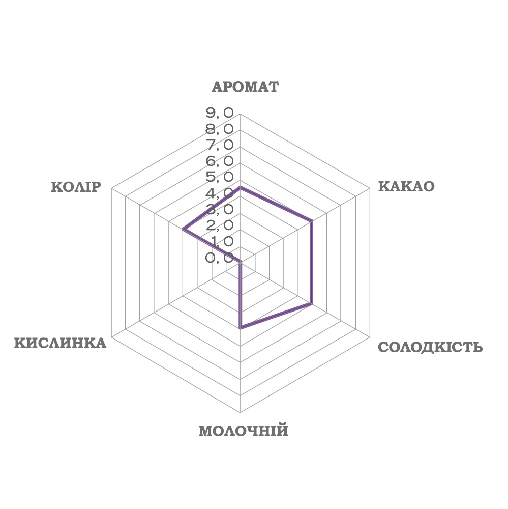 Опис: Молочний шоколад, виготовлений з какао-бобів Fino de Aroma. Молочний шоколад з характером, відомий своїм сильним смаком какао та екзотичною солодкістю, що асоціюється з тростинним цукром і солодом, які дуже добре поєднуються з молочними тонами, характерними для цього шоколаду.
