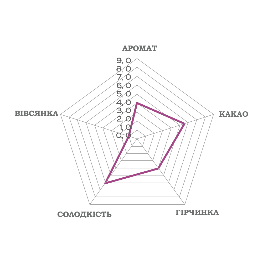 Опис: Молочний шоколад, виготовлений із какао-бобів Fino de Aroma та вівсяним борошном. Цей шоколад має ідеальну кремову текстуру, солодкий аромат карамелі, середні нотки какао та зернових з відтінками міцного горіхового смаку, поєднує в собі вершковість і тонкі злакові нотки вівсяного молока, збалансовані з нотками какао.