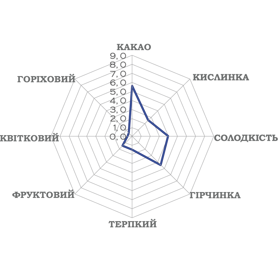 Опис: Чорний шоколад, виготовлений з какао-бобів Fino de Aroma. Має інтригуючий смак та кислуватий відтінок, що доповнює фруктову насиченість какао. Ніжний смак з гладкою текстурою і хорошим балансом між типовою гіркотою какао та солодкими тонами.